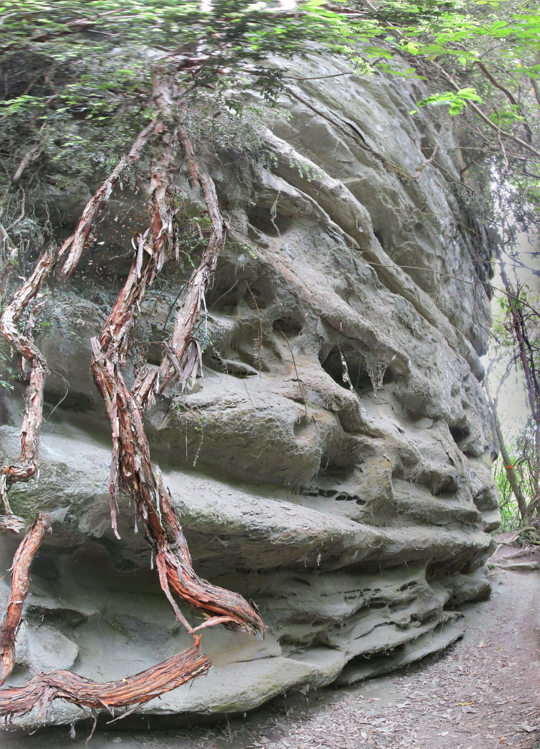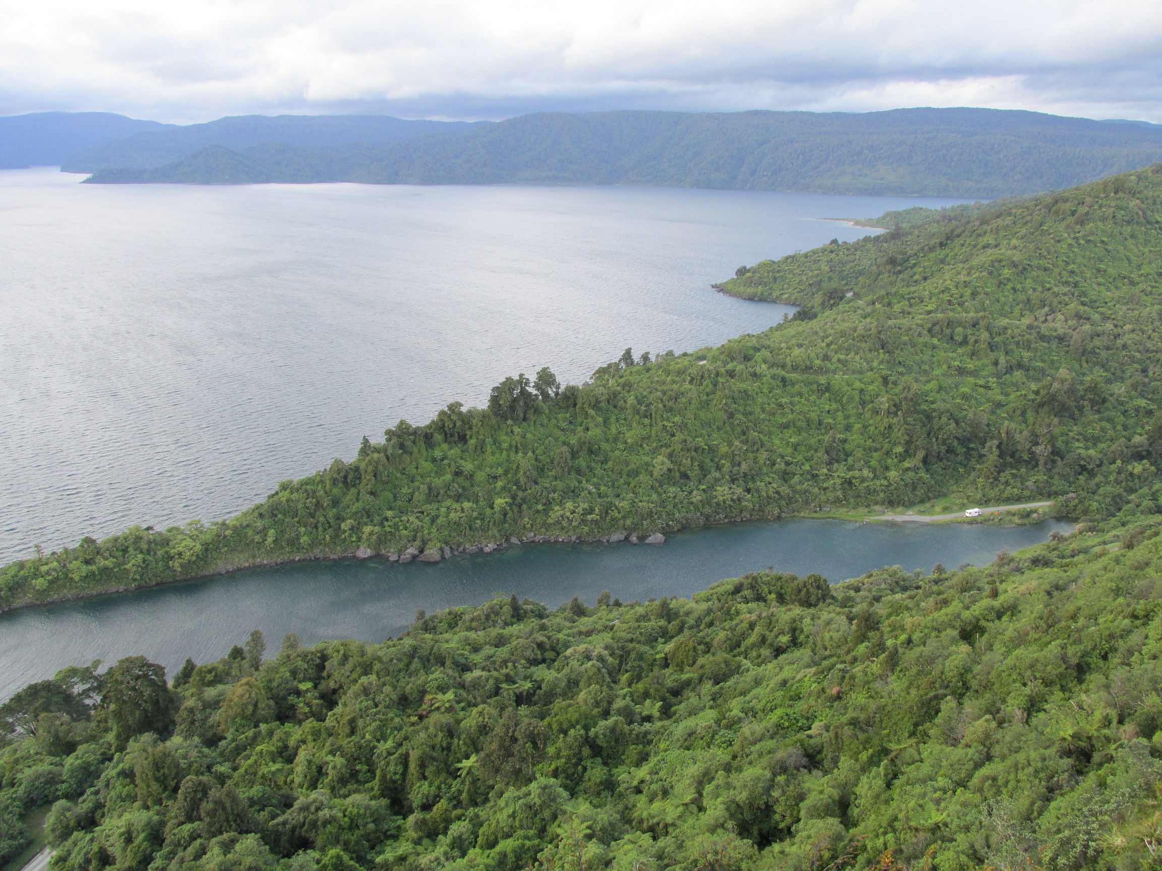 Ein paar kleinere Wanderungen habe ich mir in der Gegend nicht entgehen lassen, wie zum Beispiel Lou’s Lookout und den Onepoto Caves Track. Beide sind erlebnisreiche Wanderungen, die durch teils fast unberührte Natur verlaufen. Ersterer gibt einem einen unglaublichen Ausblick über den See und Rosie’s Bay, letzterer läuft eher unter Abenteuerausflug durch Stein- und Höhlenlandschaften. Der Höhlenpfad war allerdings irgendwann so schlecht ausgeschildert, dass ich mich durch den Dschungel bis zur Straße durchkämpfen musste, der Trampelpfad war überwuchert und nicht zu finden – gut, dass ich meinen GPS-Receiver mit topografischen Karten (Dank an OpenStreetMaps) dabei hatte. Ein paar Meter die Straße hinauf habe ich dann mitten im Dschungel an einem Fels eine Stahlleiter gefunden, die wieder zurück auf den Pfad führte – wahrscheinlich als Rettungsweg gedacht, aber auch so ganz praktisch.